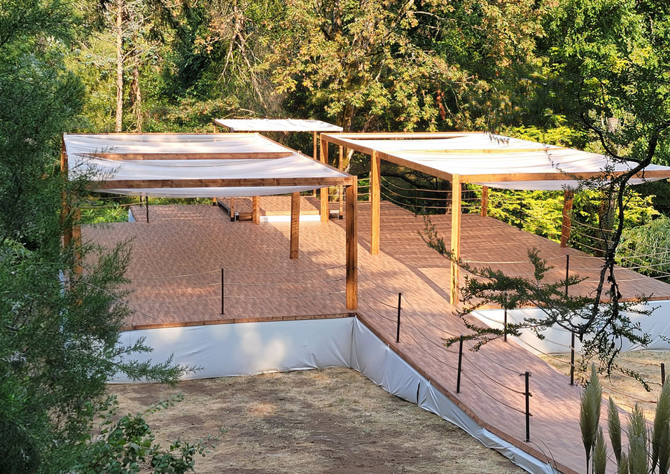 We built and dressed custom staging and provided elegant shade structures for an outside wedding.