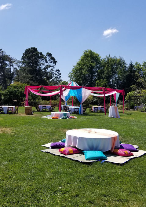 For this outdoor Sangeet, we designed a custom tent for tables with overhead treatment of airy chiffon in light pink, fuschia, pale blue, and seafoam green. For the Ceremony, a sage chiffon shade structure was set for guest seating. The Mandap structure had a lush treatment of beautiful greenery with delicate accents of white, cream, light pink, deep purple, and maroon floral.