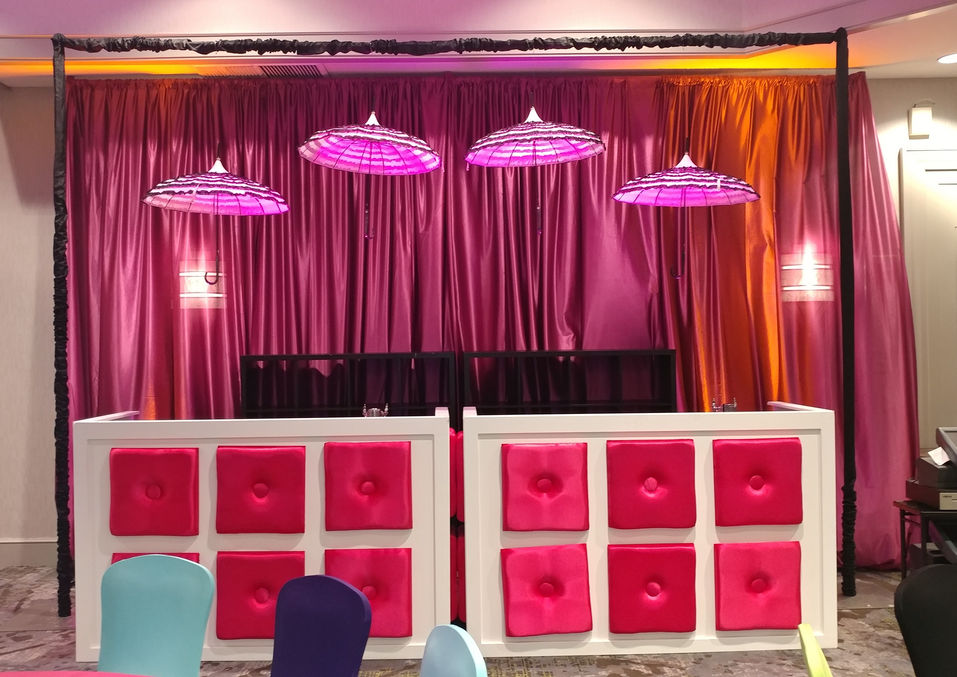 The “Mad Hatter’s Tea Party” came to life at the Marriott with a complex design using alternating colors, patterns, and textures. A colorful variety of teacups, clocks, and keys suspended from giant frames on the stage alluded to aspects of the children’s storybook. The centerpieces included leaning candelabras with candles placed slightly askew, giving guests the impression that “we are all mad here.” Miniature birds and butterflies found resting spots among colorful plumes of feathers atop stacks of teacups as additional centerpieces. The finished room consisted of an assortment of colors and textures incorporating black and white checks and stripes, layers of colorful linen and alternating chair covers, suspended lace umbrellas and tufted bar counters. Thanks to NWUCA for a theme that allowed for lots of fun and creativity!
