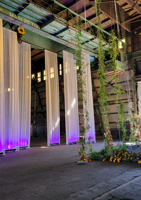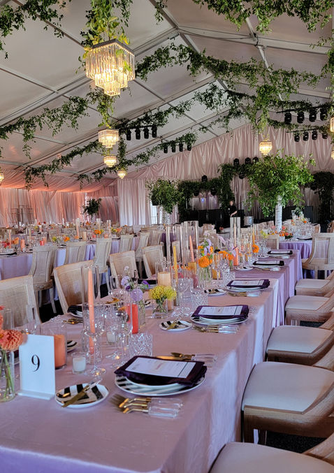 Stunning tent transformation with decking, carpeting, beautiful custom drapes, and breathtaking scenery